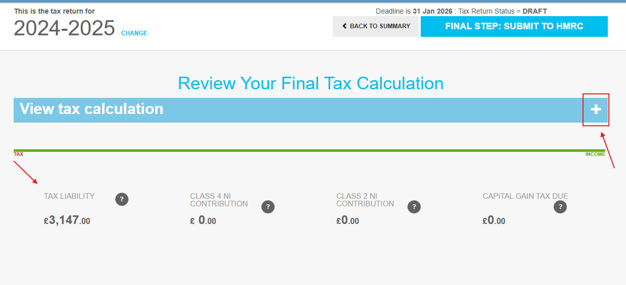 Review your tax calculation by pressing the '+' symbol to unhide it or review the payment details underneath.