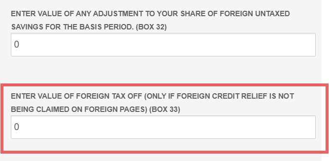 SA104 Box 32: How do I enter the value of any adjustment to my share of foreign untaxed savings for the basis period?